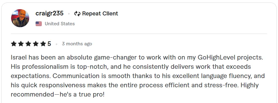 I don't just help you save time (there are plenty of other Freelancers for that). I work with you so you have certainty that you'd be getting results and your desired outcome with your gohighlevel system.
